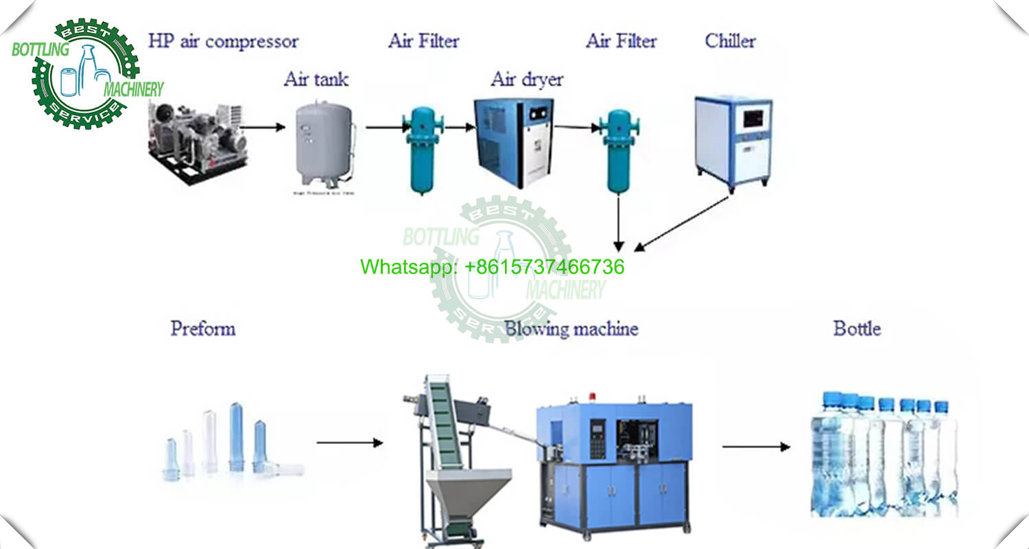 Air Compressor: Generates the high-pressure air (25-40 bar) needed to inflate preforms. Oil-free models are recommended to prevent contamination.