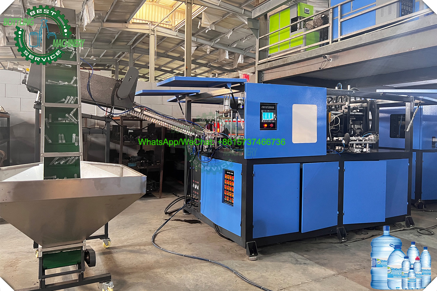 The machine consists of a preform oven and a main blow molding unit. The operation follows a clear, repeatable cycle: