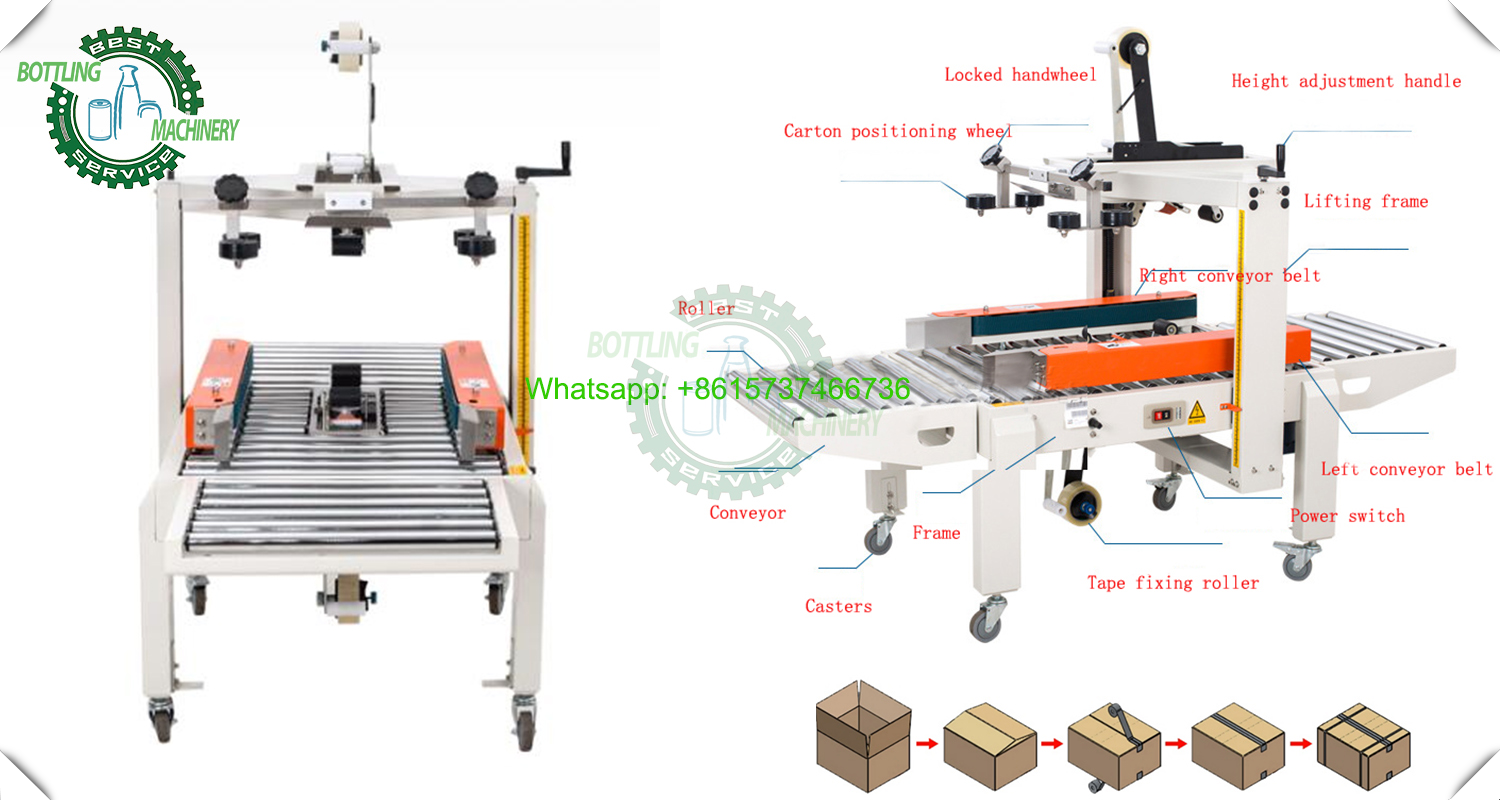 1.The semi-automatic carton box adhesive tape sealing machine is primarily used for sealing packaged cartons. It can operate as a standalone unit or be integrated into a production line, depending on the required configuration.